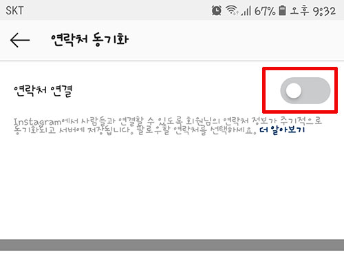 6. 연락처 연결을 비활성화시켜줍니다. 회색이 되게 해주면 됩니다. 인스타그램에서 이제 동기화는 차단되었습니다. 이제 다음 단계로 가보겠습니다.